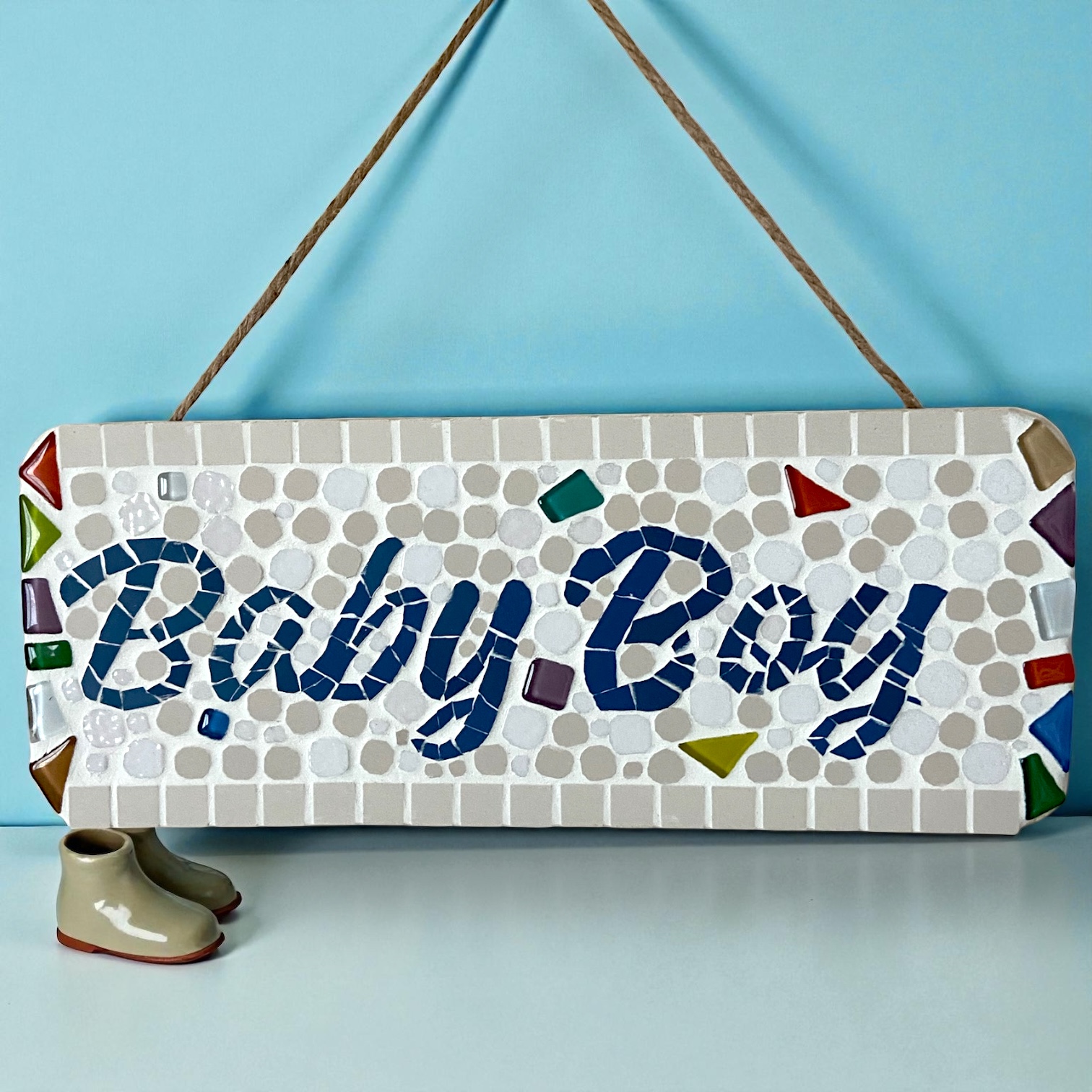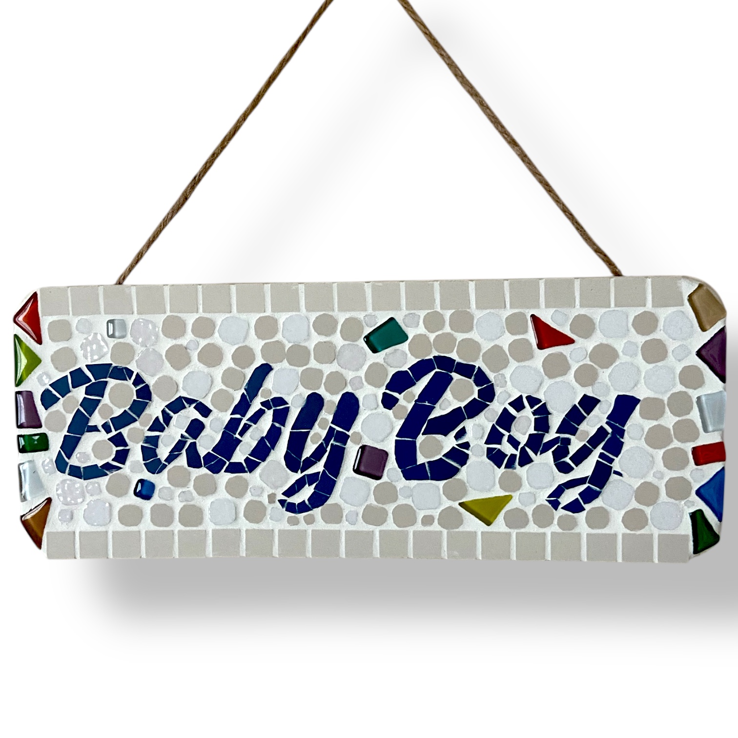 Apportez une touche de tendresse et d’authenticité à la chambre de bébé avec cette plaque à suspendre « Baby Boy » réalisée entièrement à la main en mosaïque.